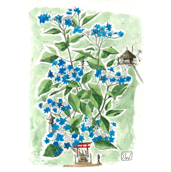 Inspiré d’un voyage au japon lors de la saison des hortensias, une cabane se hisse délicatement sur les fleurs et les feuilles. Une entrée, symbolisée par un tori, mène à travers le feuillage à la cabane solitaire.